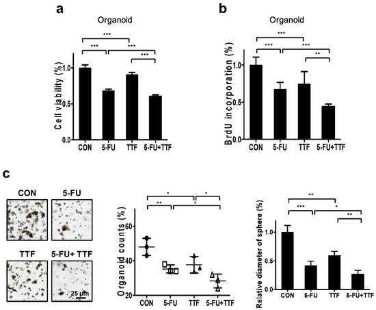 To investigate the biological effects of 5-FU and TTFields on colon cell lines, we performed MTT assay and BrdU-labeling (Figure 7a,b). The combination of 5-FU and TTFields treatment had considerably greater antitumor effect on the organoid than either treatment alone. Additionally, the spheres formed by 3D cultures were larger than those formed upon combinatorial treatment (Figure 7c).