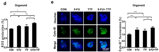 We also examined the relationship between ROS level and enhancement in TTFields-induced apoptosis by 5-FU. ROS level was more significantly induced upon combination treatment than upon individual treatments (Figure 7d), which may describe the increase in apoptotic rate upon combination treatment. As shown in Figure 7e, induced accumulation of Cyto-ID Green was shown in combination-treated organoid cells. Our result is consistent with our previous data that suggest its potential as a sensitizer in CRC.
