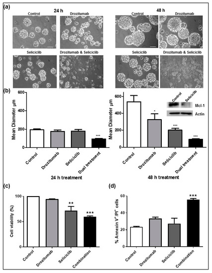 First-generation cyclin-dependent kinase (CDK) inhibitor, seliciclib, in combination with the antibody against human death receptor 5, drozitumab, reduces the diameter and viability of human Glioblastoma (GBM) neurospheres and induces apoptosis in vitro. (a,b) BT224-luc2 human GBM neurospheres were treated with seliciclib (30 μM) and drozitumab (10 μg/mL) either alone or in combination and the diameter of the human GBM neurospheres was subsequently measured using an Eclipse TE 300 inverted microscope (scale bar = 100 μm). The combination strategy, rather than either treatment alone significantly reduced the diameter of the human GBM neurospheres at 24 h post treatment, and these effects were still evident and statistically significant at 48 h post treatment; n = 3 independent experiments and a minimum of 90 human GBM neurospheres were counted for every treatment condition at each time-point. Inset Western Blot analysis of control and seliciclib-treated (30 μM) human GBM neurospheres confirmed that Mcl-1 expression was downregulated upon seliciclib treatment in the neurospheres. Actin was used as a loading control. (c) Cell survival was measured following treatment with seliciclib (30 μM) and drozitumab (10 μg/mL) either alone or in combination at 48 h. Data show cell survival relative to control values of 100%. (d) Flow cytometry was used to assess the number of PI+/AnnexinV+ human GBM neurospheres following treatment with seliciclib and/or drozitumab for 48 h. The combination strategy alone induced significant levels of apoptosis within the human GBM neurosphere populations. Data are expressed as mean ± SEM. One-way ANOVA with post-hoc Tukey analysis was used for statistical analysis, whereby, * p < 0.05, ** p < 0.01, *** p < 0.001; n = 3 independent experiments performed in triplicate. The uncropped blots and molecular weight markers are shown in supplementary materials.
