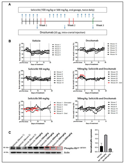 In vivo toxicity findings associated with first-generation CDK inhibitor, seliciclib, in combination with the antibody against human death receptor 5, drozitumab combined treatment. (A) Mice were treated as indicated in the toxicity study workflow. Animals were monitored daily and scored for changes in weight loss and behavior as signs of toxic effect. After three weeks, mice were sacrificed by cervical dislocation. (B) Body weights of animals that were treated with: (1) vehicles for both routes of drug administration (10% dimethyl sulfoxide (DMSO):5% Tween 20:85% 50 mM hydrochloric acid (HCl)/saline) by oral gavage, twice daily, Monday–Friday, and sterile H2O by intracranial injection, once weekly, for three weeks; (2) drozitumab, 10 μg intra-cranially once weekly for three weeks; (3) 100 or 500 mg/kg seliciclib, delivered by oral gavage twice daily, Monday–Friday for three weeks; (4) A combination of seliciclib (100 or 500 mg/kg) plus drozitumab over a three-week period (n = 6 per group). (C) Western Blot analysis of isolated brain tissue confirmed that the animals that received the higher dose of seliciclib, 500 mg/kg, had a definite and reproducible down-regulation of phospho-Rb. Actin was used as a loading control. The uncropped blots and molecular weight markers are shown in supplementary materials.