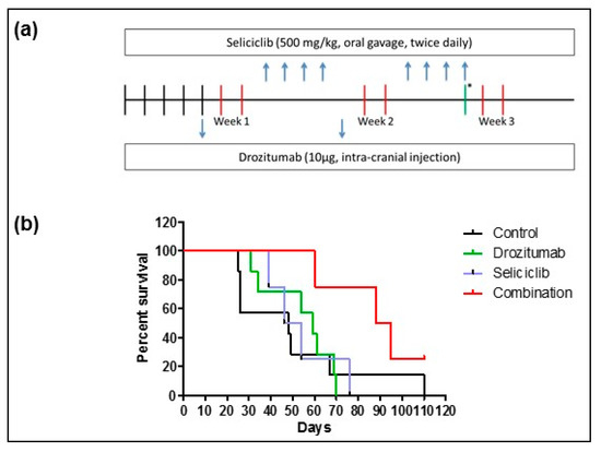 To assess the toxicity of this combination strategy in vivo, we held the dose of drozitumab, constant, 10 μg delivered intra-cranially (once weekly) [33], and delivered two escalating doses of seliciclib, 100 and 500 mg/kg, which were administered by oral gavage (twice daily, Monday–Friday) for three-weeks [37] (Figure 2a).
