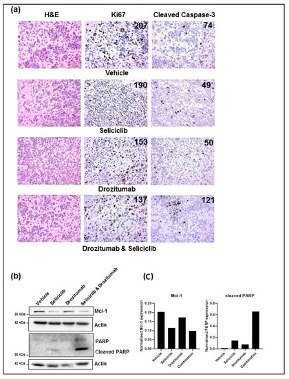 Post mortem investigations by a veterinary pathologist of animals in the survival analysis that died due to tumor burden (n = 1 per treatment group), revealed large tumors in the right hemisphere of the cerebrum in vehicle-treated animals and all treatment groups (Figure 4a; images on left of haematoxylin and eosin (H&E) staining). Ki67 positive cell counts were higher in the control animals compared with treated groups (Figure 4a); elevated levels of cleaved caspase-3 were detected in the seliciclib-treated tumor tissue and in tumors treated with the combination of seliciclib plus drozitumab (Figure 4a). These findings correlated with Western Blot analysis of the isolated tumor tissue, which showed reduced levels of Mcl-1, in both the seliciclib-only treated animals and the animals treated with seliciclib plus drozitumab (Figure 4b). However, tumors from the combination cohort displayed the highest levels of cleaved-PARP, indicating that both seliciclib and drozitumab are required to induce a substantial level of apoptotic death (Figure 4c), in agreement with what was seen in vitro (Figure 1).
