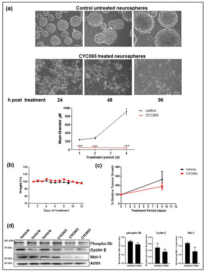 As we had administered seliciclib at concentrations exceeding those utilized in the clinic, to ensure efficacy in the brain, we conducted an additional pilot study with a second-generation CDK inhibitor, CYC065. CYC065 is mechanistically similar to seliciclib but with significantly improved potency (40-fold) and metabolic stability [39], facilitating our administration of CYC065 at clinically relevant doses, both in vitro and in vivo. The diameter of 5 μM CYC065-treated human GBM neurospheres grown in vitro was significantly decreased as early as 24 h after treatment (Figure 5a,b). This reduction in diameter was maintained over time, in contrast to control untreated human GBM neurospheres (Figure 5a). GBM tumor-bearing animals were treated by oral gavage with a single dose of CYC065 daily for nine days over a two-week treatment window. Body weight loss was used as a measure of CYC065-induced toxicity; the treatment regimen was well tolerated (Figure 5b). At the end of the treatment window, there was a trend towards a reduction in tumor volume (Figure 5c). Animals were sacrificed and tumors isolated. Western Blot analysis of CYC065 targets, cyclin E and Mcl-1, in excised tumors indicated that CYC065 delivered by oral gavage successfully crossed the BBB, as there was a reduction in these proteins in the CYC065-treated tumors but not the vehicle-treated tumors (Figure 5d).
