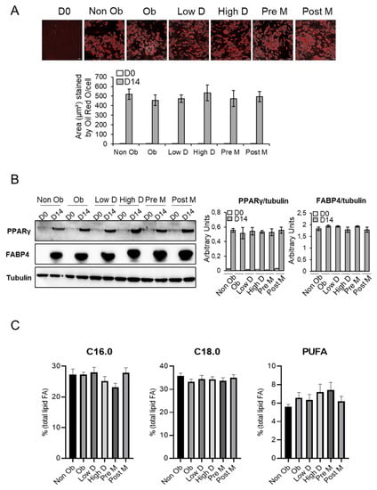 In agreement with each other, the expression of PPARγ and FABP4 were increased in a similar manner between the different groups (Figure 1B and Figure S1). Furthermore, total lipids fatty acids (FA) profiles were compared between the different groups. No changes were observed in saturated FA C16:0 and C18:0 and polyunsaturated FA (PUFA) levels (Figure 1C and Figure S2).