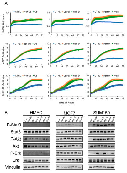 We then determined which proliferative pathways were induced by the ACM in the different cell lines. No detectable activation of any of the studied signaling pathways was observed for HMEC cells (Figure 3B, Figures S4 and S5). In clear contrast, activation of AKT signaling was observed for both MCF7 and SUM159 cells, whereas a clear activation of the STAT3 and ERK1/2 pathways was also observed for SUM159 cells. Interestingly, ERK1/2 activation was higher in the presence of ACM derived from obese, High D and Post-M individuals, than in the ACM derived from other groups (Figure 3B, Figures S4 and S5). Together, these results show that ACM increases the proliferation of breast tumor cells, but has no detectable influence on normal cells, independent of which type of individual the ACM was derived from.