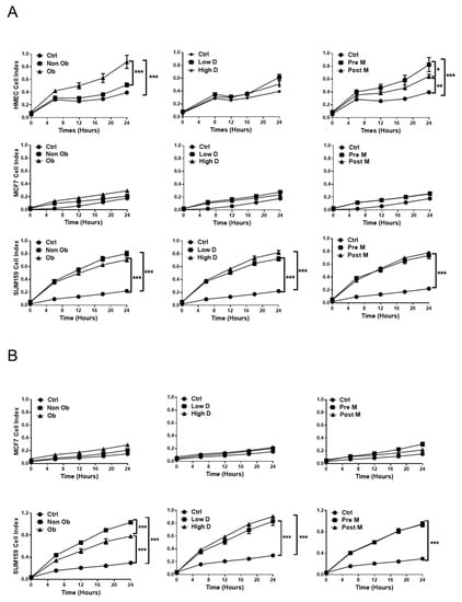 Next, the migratory and invasive capacity of normal and malignant breast cells was analyzed (Figure 4). All ACMs had some effect on the migration of HMEC cells, which was particularly marked for obese vs. non obese ACM and Pre-M vs. Post-M ACM (Figure 4A). Unexpectedly, we observed no significant effect on cell migration for MCF-7 cells, independent of which type of ACM was used, whereas all types of ACM strongly increased the migration of SUM159 cells (Figure 4A). Mammary density does not seem to have a major influence on the migration process for any of the cell lines studied (Figure 4A).
