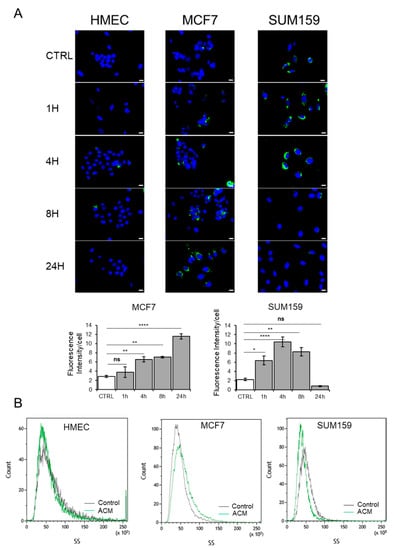 In contrast, the corresponding ACM induced a time-dependent increase in cytoplasmic lipid accumulation in MCF7 cells. In comparison, lipid accumulation reached a maximum after 4–8 h, with the SUM159 cells dropping to baseline levels by 24 h (Figure 5A). In agreement with this, we detected elevated levels of cytoplasmic granularity in MCF7 cells and a decrease in the number of granular structures in the cytoplasm of SUM159 cells by 24 h as determined by flow cytometry side scatter analysis (Figure 5B). In comparison, no detectable changes were observed for HMEC cells (Figure 5B). Similar results were obtained when cells were incubated with conditioned medium from obese postmenopausal women). Altogether, these data suggest that MCF7 cells are able to accumulate lipids, in contrast with SUM159 cells, which only accumulate lipids during the first 4–8 h and probably use them as source of energy.