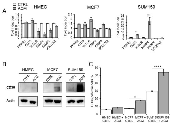 To determine whether cancer cells can accumulate FA through an increased uptake of exogenous FA, we studied the effects of ACM from non-obese premenopausal women on the expression of membrane-associated, FA-binding proteins and transporters. We found a modest increase in the expression of PPARγ, CD36 and VLDLR mRNA in the MCF7 cells, and a strong increase in the expression of CD36 and FABP4 mRNA for the SUM159 cells (Figure 6A). We did not detect any increase in all tested genes in HMEC cells. These data suggest that the ACM promotes upregulation of the scavenger receptor CD36 in the tumor cells, thereby leading to activation of the nuclear receptor PPARγ, which, in turn, results in the transcriptional induction of CD36 and FABP4 genes [27,28].
