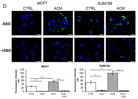To establish if the CD44+/CD36+ phenotype was associated with an increased invasive potential in the breast cancer cells, cells were treated with ACM in the presence or absence of SSO. Importantly, CD36 inhibition significantly (p ≤ 0.001) reduced the ability of the ACM to promote both the migration and invasion of SUM159 cells (Figure 7B,C).