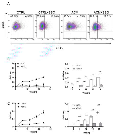 CD44+/CD36+ cells have been associated with invasion and metastasis in oral carcinoma [29]. We therefore determined if ACM exposure would also increase this phenotype in breast cancer cells. Flow cytometry analysis was used to sort cells based on expression of CD44 and CD36. The results show that exposure to ACM induced a higher fraction of CD44+/CD36+ cells compared to the untreated control cells (41.8% vs. 14.5%, respectively). Importantly, when SSO was added to the ACM, the CD44+/CD36+ fraction was reduced from 41.8% to 22.8% (Figure 7A).