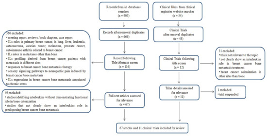 An initial literature search found 905 references, of which 151 articles were recognized using the PubMed database, 481 articles were recognized using Scopus, and 273 articles were found in the Web of Science Core Collection. Subsequently, the resulting references were submitted to a public reference manager (Mendeley 1.17.11) to eliminate duplicate articles, obtaining 666 articles. From the 666 articles obtained, after exclusion, 116 full-text articles were evaluated, of which 67 met the inclusion criteria. The 560 studies excluded from this review were excluded because they were meeting reports, reviews, book chapters, and case reports, and/or because they reported IL roles in primary breast tumor, as well as in lung, liver, and pulmonary metastasis, leukemia, osteosarcoma, ovarian tumor, melanoma, prostate cancer, autoimmune arthritis related to breast cancer, and other pathological conditions; however, they did not reveal the favorable development of bone metastases from breast cancer. In addition, we excluded studies where IL profiling was derived from breast cancer metastatic patients that were not grouped/analyzed based on the site of metastasis, and where breast cancer bone metastases were evaluated, but no IL roles/functions were examined. Finally, we also eliminated studies where responses to specific therapy (not IL-based) for breast cancer bone metastasis were analyzed, studies that evaluated the contributions of the sensory signaling pathways to neuropathic pain induced by breast cancer bone metastases, and studies on chronic stress and IL expression in breast cancer bone metastasis (Figure 1).