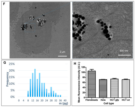 The cells were efficiently loaded with RB-nanochains-COOH, as shown in Figure 2A–D. RB-nanochains-COOH were internalized to the highest degree by the largest cells—the fibroblasts, while HCT-116 (wild type), HCT-116-GFP, and HeLa GFP-Rab7 internalized comparable quantities of chains, as assessed by average fluorescence intensity measurements. The mean red fluorescence intensity of internalized chains was 105 ± 6 for fibroblasts, 72 ± 1 for HeLa GFP-Rab7 cells, 74 ± 2 for HCT-116-GFP cells, and 71 ± 2 for HCT-116 wild type cells, respectively. Within the cells, the nanochains localized within endosomes, as evidenced in Figure 2E,F, showing HeLa cells expressing a green fluorescent rab7 protein, which is associated to early and late endosomes [25]. In HCT-116 wild type cells, which internalized the smallest amount of RB-nanochains-COOH, we quantified the iron load by single cell magnetophoresis, and determined an uptake of 17.3 ± 2.6 pg of iron per cell (Figure 2G). The mass of a single nanochain composed of 5 nanoparticle clusters is estimated to be 2.1 × 10−14 g. Since iron represents approximately 45% of nanochains, this equals 0.9 × 10−14 g of iron per chain. We thus estimate around 1800 ± 270 nanochains per cell in cancer cells. The uptake comparison among different cell types, used in this study, is shown in Figure 2H. While cancer cells internalized comparable amounts of RB-nanochains-COOH, the fibroblasts internalized about 30% more nanochains.