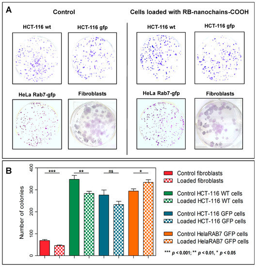 A clonogenic assay [54] was used to assess the impact of the RB-nanochains-COOH on cell long term survival. Five hundred unloaded (control) or loaded cancerous cells (prepared as described in Section 4.2.) or 250 unloaded or loaded normal dermal fibroblasts were seeded in 6-well plates. Seven or fourteen days after seeding (in case of cancer cells or fibroblasts, respectively), the colonies were rinsed with PBS, fixed with methanol, and stained with crystal violet (0.5% w/v) for 15 min under gentle stirring at room temperature, rinsed 3 times with PBS, and left to dry prior colony counting.