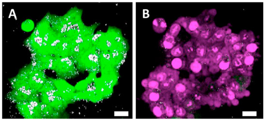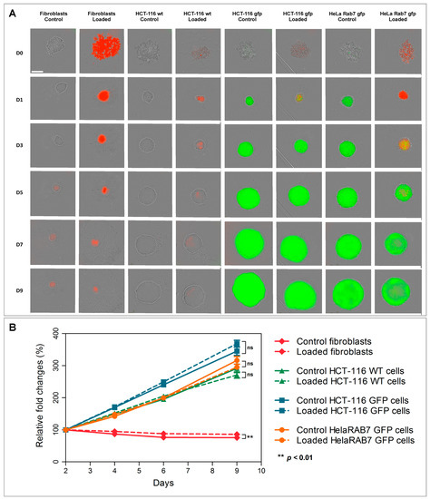 The second approach involved the formation of cellular spheroids with unloaded (control) or loaded cells and the monitoring of spheroid growth over 9 days (Figure 4A). Unloaded- and loaded-cells’ spheroids exhibited comparable growth (Figure 4B).