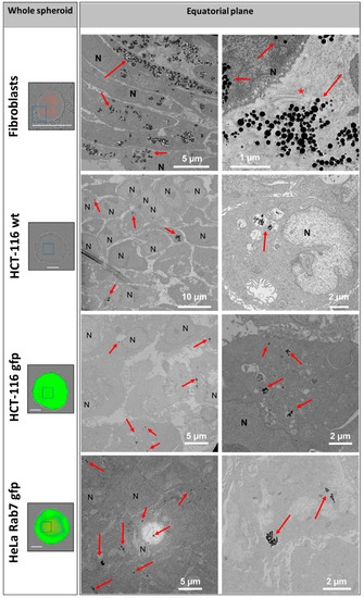 The impact of RB-nanochains-COOH on cell survival and proliferation was also determined in 3D cell cultures, where chain-loaded cells were used to make cellular spheroids. Multicellular cell spheroids (MCS) were made following the non-adherent technique, by seeding cells in Costar® Corning® Ultra-low attachment 96-well plates (Fisher Scientific, Illkirch, France). Approximately five hundred unloaded or loaded cancer cells (HCT116, HCT116-GFP, or HeLa GFP-Rab7) of five thousand unloaded or loaded fibroblasts were seeded per well in 250 µL of cDMEM. Plates were cultivated in 5% CO2 humidified atmosphere at 37 °C. Single MCS were obtained in each well 24 h after seeding. The MCS growth was followed over a period of 9 days with video-microscopy, as described in Section 4.3. At the end of this period, the spheroids were fixed and processed for TEM, as described in Section 4.4.