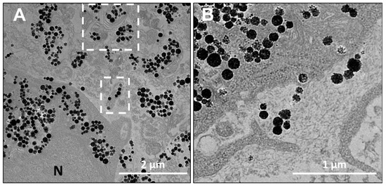 On the nanoparticle level, the nanochains did not undergo any major structural disintegration (Figure 6 and Figure S3). Their architecture at day 11 (when the spheroids were fixed and processed for TEM, as evidenced in multicellular spheroids in Figure 5, Figure 6 and Figure S3), remained comparable to their initial structure, which was observed in freshly loaded cells (Figure 2B) when the cells were seeded to form spheroids. Indeed, over time the chains are expected to degrade, as silica metabolizes to silicic acid [42], which is excreted in the urine [43]. On the other hand, the iron, stemming from iron oxides, is integrated into the metabolic pathway of endogenous iron [44].