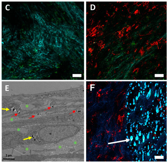 Nanochains as photothermal mediators affecting the cells and the extracellular matrix. (A) HCT-116-GFP cells (green) loaded with nanochains-COOH (white spots), exposed to the laser within the multiphoton microscope. (B) Nanochains-COOH-loaded HCT-116-GFP cells, which underwent cell death and thus internalized propidium iodide after laser exposure (the red fluorescence derived from cell-internalized propidium iodide is here represented by a magenta pseudo-color). (C) Representative micrograph of a control cell sheet exhibiting a rich collagenous matrix (turquoise) among auto-fluorescent (green) fibroblast cells (D) Representative micrograph of a cell sheet loaded with red-fluorescent RB-nanochains-COOH surrounded with collagen (turquoise) and fibroblasts (green). (E) TEM micrograph showing the distribution of RB-nanochains-COOH within the cell sheet. N denotes cell nucleus, yellow arrows point to intracellularly localized nanochains and red arrows point to extracellular nanochains. Green asterisks denote the collagen fibers in the extracellular matrix. (F) Representative micrograph of a cell sheet: exhibiting on the left side the intact collagen fibers (exposed to 20 mW laser power), and on the right side the melted collagen fibers (exposed to 33 mW laser power power). Scale bars in (A–D,F) equal 20 µm. White arrow in (F) points to a characteristic “drop” of melted collagen fibers.