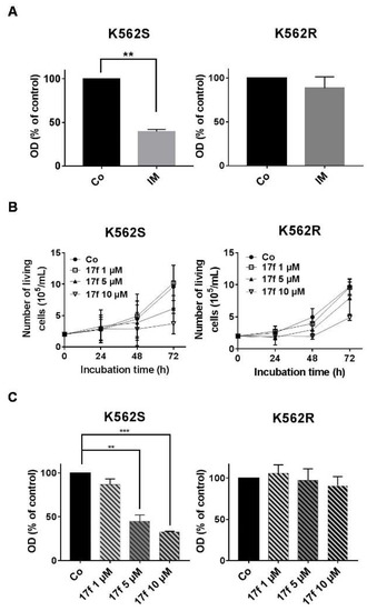 Initial experiments were carried out to determine the effects of 17f alone (see structure in Figure S1) on K562 cells that are sensitive (K562S) or resistant (K562R) to IM treatment. These in vitro models are depicted in Figure 1A. Sensitive and resistant cells were treated with various concentrations of 17f (ranging from 1 to 10 µM). Growth and viability were determined by trypan blue exclusion (Figure 1B) and MTT (3-(4,5-dimethylthiazol-2-yl)-2,5-diphenyltetrazolium bromide) (Figure 1C) assays. Addition of 17f clearly blocked the growth of K562S cells while K562R cells remain insensitive to 17f treatment at the same concentration. The EC50 value was found to be two times higher in K562R cells than in K562S cells (14.5 ± 4.8 µM vs. 6.9 ± 1.7 µM). We also observed that treatment with 5 µM 17f did not affect the growth and viability of K562R cells and used this suboptimal concentration in most experiments to evaluate the combined effects of 17f and IM.
