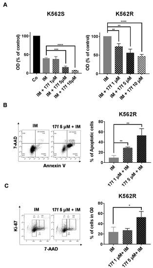 We then addressed whether 17f in combination with IM might directly abrogate the resistance of K562R cells to IM. K562S and K562R cells were treated with 17f in the presence of IM and cell growth and viability were determined by MTT assays (Figure 2A). As expected, IM strongly inhibited the growth of K562S cells. This inhibition was further enhanced by 17f in a dose-dependent fashion. Interestingly, we found that the addition of 1 µM 17f in the presence of IM was already enough to significantly reduce the growth and viability of K562R cells. Treatment with 5 µM and 10 µM of 17f further increased this inhibitory effect. To analyze the growth-suppressive properties of 17f in K562R cells, we determined the impact of this small molecule on apoptosis and the cell cycle. 17f induced apoptosis and changes in cell cycle phase distribution in a concentration-dependent manner (Figure 2B,C). 17f significantly increased the number of cells in the G0 phase indicating that treatment with this compound induced quiescence of K562R cells.
