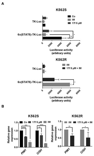 We previously showed that 17f inhibits the transcriptional activity of STAT5 in CML cells. We then asked whether this small molecule also affects the activity of these proteins in IM-resistant K562R cells. We first determined the impact of this compound on the transcriptional activation of a reporter gene driven by a STAT5-specific promoter. K562S and K562R cells were transfected with a construct containing six tandem copies of the STAT5 response element in front of the minimal TK promoter fused to the luciferase reporter gene (6×(STAT5)-TK-luc). As control, cells were also transfected with a TK-luciferase vector without STAT5 response elements (TK-luc). Luciferase activity was determined 48 h post-transfection in K562S and K562R cells treated with DMSO as control, 17f (5 µM) and/or IM (1 µM). As expected, constitutive STAT5 activity induced by BCR-ABL increased luciferase activity in K562S cells transfected with the STAT5-dependent promoter construct compared to cells transfected with the control TK-luc vector (Figure 3A). This enhanced luciferase activity was strongly reduced after 17f or IM treatment. In sharp contrast, the luciferase activity remained elevated after treatment with IM in K562R cells transfected with the STAT5-dependent reporter construct, although this enzymatic activity was strongly decreased after the addition of 17f and IM. qRT-PCR experiments were then conducted to determine the effects of 17f on STAT5-dependent expression of target genes such as PIM1 and CISH (Figure 3B). As expected, 17f or IM reduced expression of both genes in sensitive K562S cells while this effect was observed in resistant K562R cells after treatment with both compounds. Collectively, these data strongly suggest that 17f inhibits the transcriptional activity of STAT5 to bypass IM resistance in K562R cells.