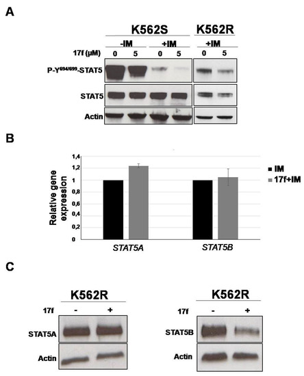 We then determined the impact of 17f on BCR-ABL-induced tyrosine phosphorylation of STAT5 (P-Y694/699-STAT5) by western blot and flow cytometry analysis (Figure 4A, Figures S2–S4). K562S and K562R cells were treated for 24 h instead of 48 h to analyze the early effects on STAT5 phosphorylation. IM strongly reduced P-Y-STAT5 levels in K562S, and the addition of 17f further enhanced this effect. P-Y-STAT5 levels were maintained in IM-treated K562R cells but were decreased after the addition of 17f. Interestingly, the level of STAT5 phosphorylation was strikingly enhanced in K562R cells after removal of IM and was weakly affected by the addition of 17f (Figure S5). To determine whether changes in P-Y-STAT5 levels reflect differences in protein abundance, immunoblots were performed with an anti-STAT5 antibody that recognizes STAT5A and STAT5B proteins (Figure 4B and Figure S2). As expected, IM inhibited the phosphorylation of STAT5 in sensitive and resistant cells. Interestingly, we observed that the association of 17f with IM reduces STAT5 expression in K562R cells but not in K562S cells (see Figure S3A,B for quantification). qRT-PCR experiments were then conducted to evaluate the impact of combination treatments on STAT5A and STAT5B gene expression in K562R cells. Results showed that STAT5A/5B mRNA levels were not affected by 17f when associated with IM (Figure 4B). In contrast, western blot analysis clearly evidenced that STAT5B protein expression was decreased after combination treatments suggesting that 17f sensitizes K562R cells to IM treatment by targeting STAT5B protein (Figure 4C).