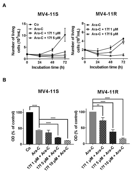 We then analyzed the effects of 17f on MV4-11S and MV4-11R cell growth in the presence of Ara-C using trypan blue dye exclusion (Figure 6A) and MTT assays (Figure 6B). Addition of 17f significantly enhanced the growth inhibition and cytotoxic effect of Ara-C in MV4-11S cells. Importantly, 17f greatly reduced the growth of resistant MV4-11R cells cultured with Ara-C in a concentration-dependent fashion. This growth inhibition was already observed with 1 µM, a concentration that did not affect the growth of MV4-11R cells cultured in the absence of Ara-C. These data indicated that the addition of 17f overcomes the resistance of MV4-11R cells to Ara-C.