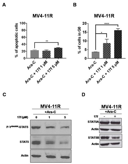 We then evaluated the effects of 17f on apoptosis and the cell cycle in MV4-11R cells. A significant increase in apoptotic cells was observed (Figure 7A) only after treatment with 5 µM 17f, while the addition of 1 µM was enough to enhance the number of cells in the G0 phase of the cell cycle (Figure 7B). These results indicated that the growth-suppressive properties of 17f primarily affect the cell cycle in MV4-11R cells and apoptosis at higher concentrations. We then asked whether 17f interferes with STAT5 signaling in Ara-C-resistant AML cells and analyzed the impact of 17f on phosphorylation and expression of STAT5 in MV4-11R cells. In the absence of Ara-C, the level of STAT5 phosphorylation was slightly enhanced in MV4-11R cells (Figure S5C,D). The addition of 17f with or without Ara-C inhibited STAT5 expression in MV4-11R cells (Figure 7C and Figures S2B and S3C). Likewise, STAT5B expression was reduced after treatment with 17f alone or with Ara-C in resistant cells (Figure 7D).
