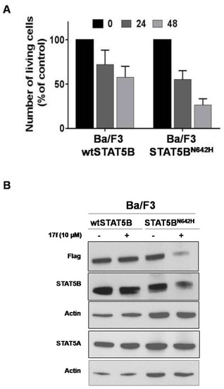 Gain of function mutations of STAT5B have been described in hematopoietic malignancies. The recurrent hotspot mutation N642H has been identified in T cell leukemia and lymphomas and the STAT5BN642H mutant was shown to induce T cell neoplasia in transgenic mice [24,25,26,27]. We therefore tested the ability of 17f to inhibit STAT5BN642H expression and growth of hematopoietic cells transformed by this mutant. For this purpose, we used Ba/F3 cells expressing flag-tagged STAT5BN642H or flag-tagged wild-type STAT5B (wtSTAT5B) as control [27]. We found that Ba/F3-STAT5BN642H cells were more sensitive to 17f treatment than control Ba/F3-wtSTAT5B cells (Figure 8A). We then addressed whether STAT5N642H expression was impacted by 17f and showed that 17f reduces expression of this mutant in Ba/F3 cells but does not affect wtSTAT5B or endogenous STAT5A expression after 24 h treatment (Figure 8B).