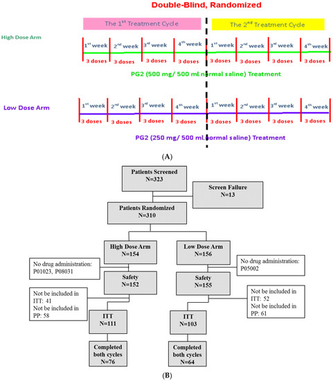 The study was designed to be a multi-center, randomized, double-blind study with two arms. Patients who met the enrollment criteria and provided written informed consent were randomly assigned to 2 groups at a 1:1 ratio: the high dose (500 mg/day) group and the low dose (250 mg/day) group. Details of the randomization and blinding procedures are given below. Patients in either group received 500 mg/day or 250 mg/day PG2 injection 3 times per week for 4 weeks per cycle. It was intended that recruited patients would complete two cycles in this study. The study protocol is summarized in Figure 1A. Based on our previous studies and ethical considerations, the trial did not include a placebo control arm [14]. The study started in November 2012 and was completed in June 2017 (Clinical trial information: NCT01720550).