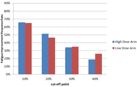This study compared the fatigue improvement response rate between the high dose and low dose arms by different cut-off values at the end of the first treatment cycle (i.e., the end of week 4) as the result of primary efficacy evaluation. For the week 4 primary endpoint, if the data were not available at time of the last visit of the first treatment cycle, the data from the first visit in the second treatment cycle were used to replace the data of the last visit of first treatment cycle for analyses. Each subject was classified as a responder or non-responder to fatigue improvement. Responders to fatigue improvement were determined by different cut-off values as the improvement in fatigue scores by at least 10% from baseline (the efficacy evaluation of the first visit in each treatment cycle).