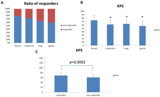 Fatigue Improvement Response Rate and KPS for patients with different cancer types. (A) Breast, colon, lung, and gastric cancer patients were selected for analysis. Fatigue improvement response rates for these patients were analyzed and compared. (B) KPS for breast, colon, lung, and gastric cancer patients were analyzed and compared. (C) KPS for responders and non-responders in the overall patient population. (* p < 0.01 versus breast cancer patients).