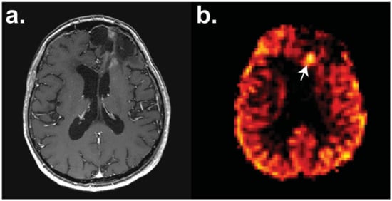 - Sharma, R.; D’Souza, M.; Jaimini, A.; Hazari, P.P.; Saw, S.; Pandey, S.; Singh, D.; Solanki, Y.; Kumar, N.; Mishra, A.K.; et al. A comparison study of 11C-methionine and 18F-fluorodeoxyglucose positron emission tomography-computed tomography scans in evaluation of patients with recurrent brain tumors. Indian J. Nucl. Med. 2016, 31, 93–102. [Google Scholar] [CrossRef]
