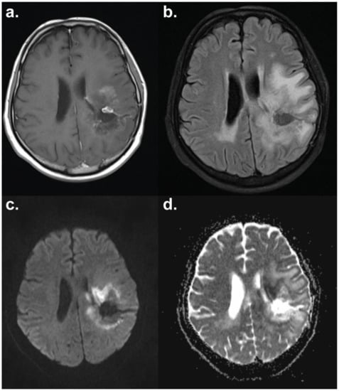 - Chu, H.H.; Choi, S.H.; Ryoo, I.; Kim, S.C.; Yeom, J.A.; Shin, H.; Jung, S.C.; Lee, A.L.; Yoon, T.J.; Kim, T.M.; et al. Differentiation of true progression from pseudoprogression in glioblastoma treated with radiation therapy and concomitant temozolomide: Comparison study of standard and high-b-value diffusion-weighted imaging. Radiology 2013, 269, 831–840. [Google Scholar] [CrossRef]