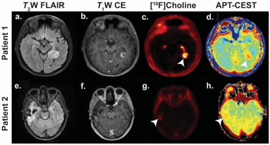 Detection of recurrence in two patients using 18F-choline and amide proton transfer- chemical exchange saturation transfer (APT-CEST). Patient 1 (a–d): WHO grade I pilocytic astrocytoma initially treated with radiotherapy. Imaging performed four years later when the patient re-presented with seizures. Patient 2 (e–h): WHO grade IV glioblastoma multiforme treated with surgery and chemoradiotherapy. Imaging surveillance performed eighteen months after completing initial treatment. Tumours indicated with white arrowheads. Abbreviations: T2W FLAIR, T2-weighted fluid-attenuated inversion recovery; T1W CE, T1-weighted contrast enhanced. Images courtesy of Dr Harpreet Hyare, University College London Hospital.