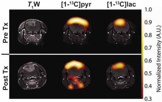 Representative images following injection of hyperpolarised (1-13C)pyruvate in a C6 glioma-bearing rat before (top, PreTx) and 96 h after radiotherapy (bottom, PostTx). Images of (1-13C)pyruvate ((1-13C)pyr) and (1-13C)lactate ((1-13C)lac) overlaid on coronal T1W MR images. A reduction in (1-13C)lactate production was observed in all tumours after 15 Gy irradiation without decreases in tumour volume. Adapted with permission from Day et al. [].
