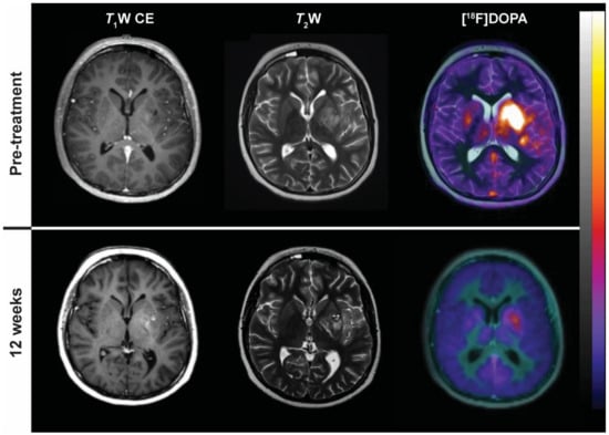 18F-dihydroxyphenylalanine (18F-DOPA) uptake in a patient with glioblastoma multiforme treated with chemoradiotherapy before (top row) and after 12 weeks (bottom row). From left to right: Post-gadolinium T1W axial MRI; T2W axial MRI; fusion PET/MRI with 18F-DOPA.