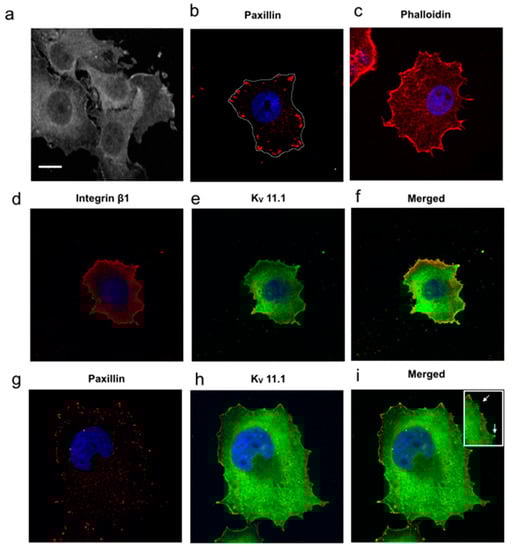 - Cherubini, A.; Hofmann, G.; Pillozzi, S.; Guasti, L.; Crociani, O.; Cilia, E.; Di Stefano, P.; Degani, S.; Balzi, M.; Olivotto, M.; et al. Human ether-a-go-go-related gene 1 channels are physically linked to beta1 integrins and modulate adhesion-dependent signaling. Mol. Biol. Cell. 2005, 16, 2972–2983. [Google Scholar] [CrossRef] [PubMed]