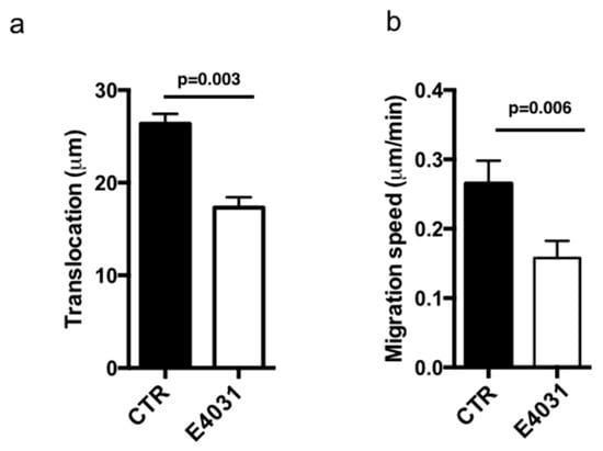 We then studied the role of KV11.1 on cell migration of PANC-1 cells, seeding them onto FN for two hours and collecting time-lapse images for further four hours in the absence or in the presence of E4031. Single cell traces were analyzed and both translocation (net distance covered during the course of the experiment; measured in µm) and migration speed (measured as µm/min) were determined. The treatment with E4031 produced a statistically significant decrease in both parameters (Figure 3a,b).