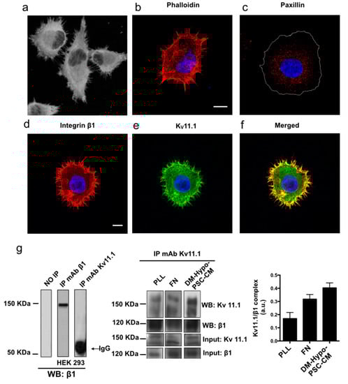 On the contrary, stress fibers were barely detectable. Consistently, focal adhesions were rare and sparse throughout the cell, as witnessed by paxillin staining (Figure 4c). β1 integrins were mainly localized at the tips of such protrusions (Figure 4d), confirming their filopodial nature. Also KV11.1 was present in filopodia (Figure 3e), and co-localized with β1 integrins (Figure 4f). Interestingly, KV11.1 and β1 integrin co-immunoprecipitated in PANC-1 cells cultured in DM plus Hypo-PSC-CM at higher extent when compared to what occurred when cells were cultured on FN (Figure 4g). Overall, PANC-1 cells cultured on DM plus Hypo-PSC-CM emit numerous filopodia, and hence represent a good model wherein to study the role of KV11.1 on filopodia organization.