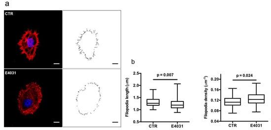 The effect of KV11.1 on f-actin organization in filopodia was hence tested by analyzing the effects of E4031. Figure 5a shows representative confocal images of phalloidin-stained f-actin of PANC-1 cells in the absence or in the presence of E4031. Filopodia were detected and their length and density were measured (top and bottom right images in Figure 5a). When treated with E4031, PANC-1 cells displayed filopodia that were significantly shorter (median values 1.2 and 1.3 µm, respectively, p = 0.007), although with significantly higher density (median value 0.12 and 0.11 µm-1, respectively, p = 0.024) compared to control conditions, CTR (Figure 5b).