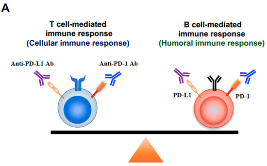 A concept of “immune normalization” for the class of drugs called immune checkpoint inhibitors has recently been proposed [1,5]. However, immune checkpoint inhibitors do not always change the immune balance toward a favorable direction for anti-tumor immunity. MG is a B cell–mediated autoimmune disease in which the target auto-antigen is AChR at the neuromuscular junction and also has been known as one of the life-threatening irAEs associated with immune checkpoint blockade for malignancies [14,15,16,35]. PD-1 expresses on activated B cells as well as activated T cells [33,36,37], which indicates that there is a potential risk of triggering B cell–mediated autoimmune disease such as MG by the blockade of the interaction between PD-1 and PD-L1. The evidence suggests that blocking PD-1/PD-L1 signaling may shift the systemic immune balance from the T cell-mediated immune response (cellular immune response) to the B-cell mediated immune response (humoral immune response) [33,36,37] which enhances pre-existing anti-AChR antibody, and may lead to the onset of MG as an irAE (Figure 5A).