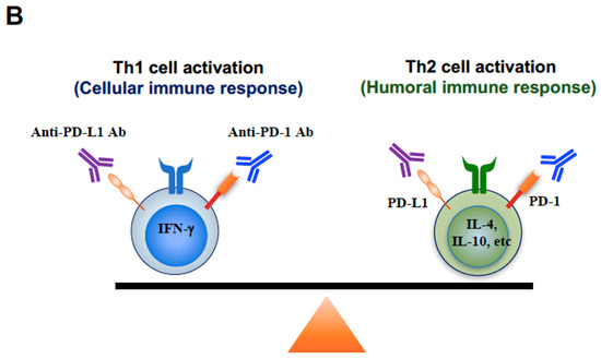 CD4+ T cells include T helper type 1 (Th1), which drives the cellular immune responses, and CD4+ T helper 2 (Th2), which promotes humoral immune responses. Th2 cells enhance B-cell mediated immunity and promote antibody production [38,39]. PD-1 expresses on Th2 cells as well as Th1 cells and CD8+ T cells. Therefore, the blockade of PD-1/PD-L1 signaling has been shown to promote Th2 cell responses and Th2-type inflammations [13,40], which suggests that immune checkpoint blockade has the potential to modulate the balance between cellular immune response and humoral immune response and may lead to the onset of MG (Figure 5B).