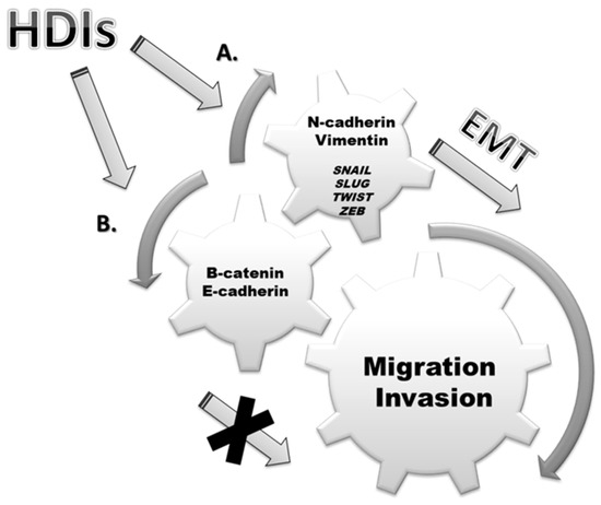 Histone deacetylase inhibitors (HDIs) are effective anti-cancer agents which, in monotherapy and/or in combination with conventional chemotherapeutics, exhibit anti-neoplastic properties through cell-cycle arrest, inhibition of migration and invasion, induction of differentiation and apoptosis in many types of cancer cells [5,6,7,8]. Combinations of HDIs with e.g., thienotriazolodiazepine (JQ1), an inhibitor of bromodomain-containing acetylation reader proteins like bromodomain-containing protein 4 (BRD4), have shown efficacy in several cancer types, including urothelial carcinoma [9]. It has been reported that HDIs can reverse EMT, a process called mesenchymal-epithelial transition (MET), through, inter alia, unblocking of E-cadherin repression in solid cancers [10]. Thus, suggesting that HDIs have a therapeutic role in inhibition of EMT in cancer cells [11,12,13,14]. However, conflicting results have been also found, where HDIs induced EMT by reversing stem cell-like properties and enhanced metastasis [15]. In this review we discuss the impact of various HDIs on epithelial and mesenchymal markers, as well as on migration and invasion of cancer cells (Figure 1). The efficacy of HDIs has been demonstrated in both in vitro and animal models in monotherapy and/or in combination with existing or novel chemotherapeutics.