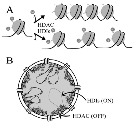(A) Effect of histone deacetylase inhibitors (HDIs) on chromatin remodeling. Acetylation (Ac) of histones results in changes in chromatin conformation, where non-acetylated histones form heterochromatin (close chromatin) while acetylated histones result in relaxed chromatin—allowing DNA-binding by transcription factors. (B) Chromosomal landscape in the nucleus in the presence and absence of HDIs. Closed chromatin is near the nuclear envelope, while relaxed chromatin, where transcription is possible, is found in the middle of nucleus.