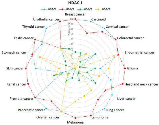 Percentage (%) of patients with high or medium HDACs class I expression levels in different types of cancer [43,44,45,46].