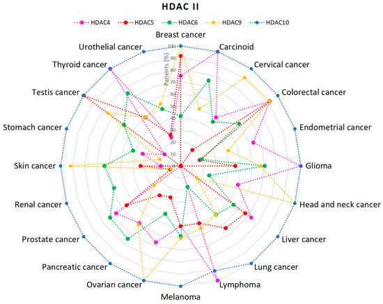 Percentage (%) of patients with high or medium HDACs class II expression levels in different types of cancer. HDAC7 was not analyzed [47,48,49,50,51,52].