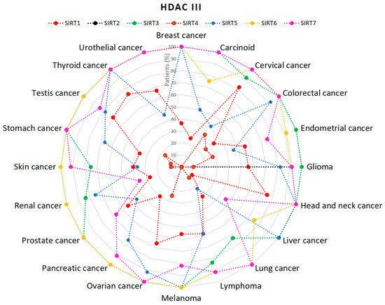 Percentage (%) of patients with high or medium HDACs class III expression levels in different types of cancer. There is no available data regarding the expression of HDAC11 (HDAC IV) [53,54,55,56,57,58,59,60].