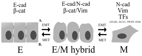 Phenotypical transformation of cells during the epithelial–mesenchymal transition (EMT) and mesenchymal-epithelial transition (MET) processes. (A) During EMT epithelial cells lose their polarized organization and acquire migratory and invasive capabilities by increase in mesenchymal markers (N-cadherin, vimentin) and EMT-related transcription factors (TFs) (SNAIL, SLUG, TWIST, ZEB). (B) During MET cells re-acquire epithelial properties. Epithelial cells are connected by intercellular junctions and they exhibit apical-basal polarization. The intermediate stage between fully-epithelial and fully-mesenchymal states has been described as E/M hybrid state. Cancer cells with E/M hybrid phenotype have cell-cell adhesion properties as well as migration abilities, simultaneously. E: epithelial; E/M hybrid: epithelial/mesenchymal hybrid; M: mesenchymal; E-cad: E-cadherin; β-cat: β-catenin; N-cad: N-cadherin; Vim: vimentin; TFs: transcription factors; SNAIL, SLUG, TWIST, ZEB: mesenchymal transcription factors.