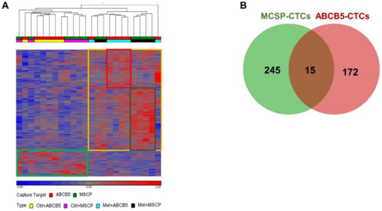 MCSP and ABCB5 CTCs have distinctive gene expression patterns. (A) Unsupervised hierarchical clustering analysis of differentially expressed genes between CTC fractions enriched from samples of healthy donors (N = 6) and melanoma patients (N = 6) using immunomagnetic beads targeting MCSP or ABCB5. Each row is a single gene and each column is a single sample. Red indicated up-regulation and blue indicates down-regulation according to the colour scale at the bottom. The squares indicate the genes that were up-regulated in melanomas (yellow box) and in controls (light green box). Genes that are differentially expressed (with ANOVA p < 0.05 and fold difference 2 vs. respective controls) in either cell type (MSCP or ABCB5 CTCs) were used to perform an unsupervised hierarchical clustering. This analytical approach discriminated the gene expression patterns from MCSP- (dark green box) and ABCB5-enriched (red box) CTC fractions. (B) Comparison of up-regulated genes between MCSP- (green circle) and ABCB5-enriched (red circle) CTC fractions found only 15 genes shared between these two CTC fractions.