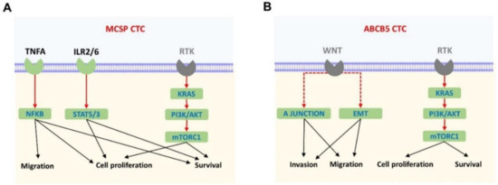The most significant finding from this study is that, based on gene expression data, MCSP- and ABCB5-enriched CTCs are two distinct cell subpopulations. This is based on the limited overlap observed between the genes found to be up-regulated in MCSP and ABCB5 CTCs and the different pathways prominently enriched in these two CTC-enriched fractions. MCSP is a melanocytic membrane proteoglycan involved in melanomagenesis, tumour growth, motility, and tissue invasion of melanoma cells through activation of integrin function, FAK (focal adhesion kinase) signalling, ERK signalling, and matrix metalloproteinase 2 [25,34,35,36,37]. Because MCSP is expressed in over 90% of melanomas [25], this cell surface proteoglycan has been used as a conventional marker for the capture and detection of CTCs, but little is known of its efficacy in identifying CTCs or about the biology of MCSP-positive CTCs [5,7,8,9,10,11,22,23,24]. Here, our gene set enrichment analysis (GSEA) performed with genes found to be significantly up-regulated in the MCSP-enriched CTC fractions, showed that the TNFA_SIGNALING_VIA_NFKB hallmark was most significantly enriched in this CTC-subtype. Furthermore, IL2_STAT5_SIGNALING, MTORC1_SIGNALING, and IL6_JAK_STAT3_SIGNALING were hallmarks of the MCSP-enriched CTC fractions. The enrichment of these cellular networks in these CTC fractions is interesting as MCSP tumorigenic signalling depends on the activation of SRC kinases, FAK, STAT transcription factors and apoptotic regulators including TP53, TOR and JNK [26]. These findings indicate that MCSP CTCs are equipped with tumorigenic capabilities, such as maintenance of cell survival, cell proliferation, and migration, as they travel through the bloodstream (Figure 3). Nevertheless, the limited overlap in gene expression observed between single tumour cells and these CTC fractions might indicate that these cellular networks might function differently in CTCs in comparison to tissue-derived tumour cells. An in-depth understanding of MCSP-driven signalling in the biology of MCSP-positive tumour cells and CTCs and its role in melanomagenesis and metastasis demands further investigation.